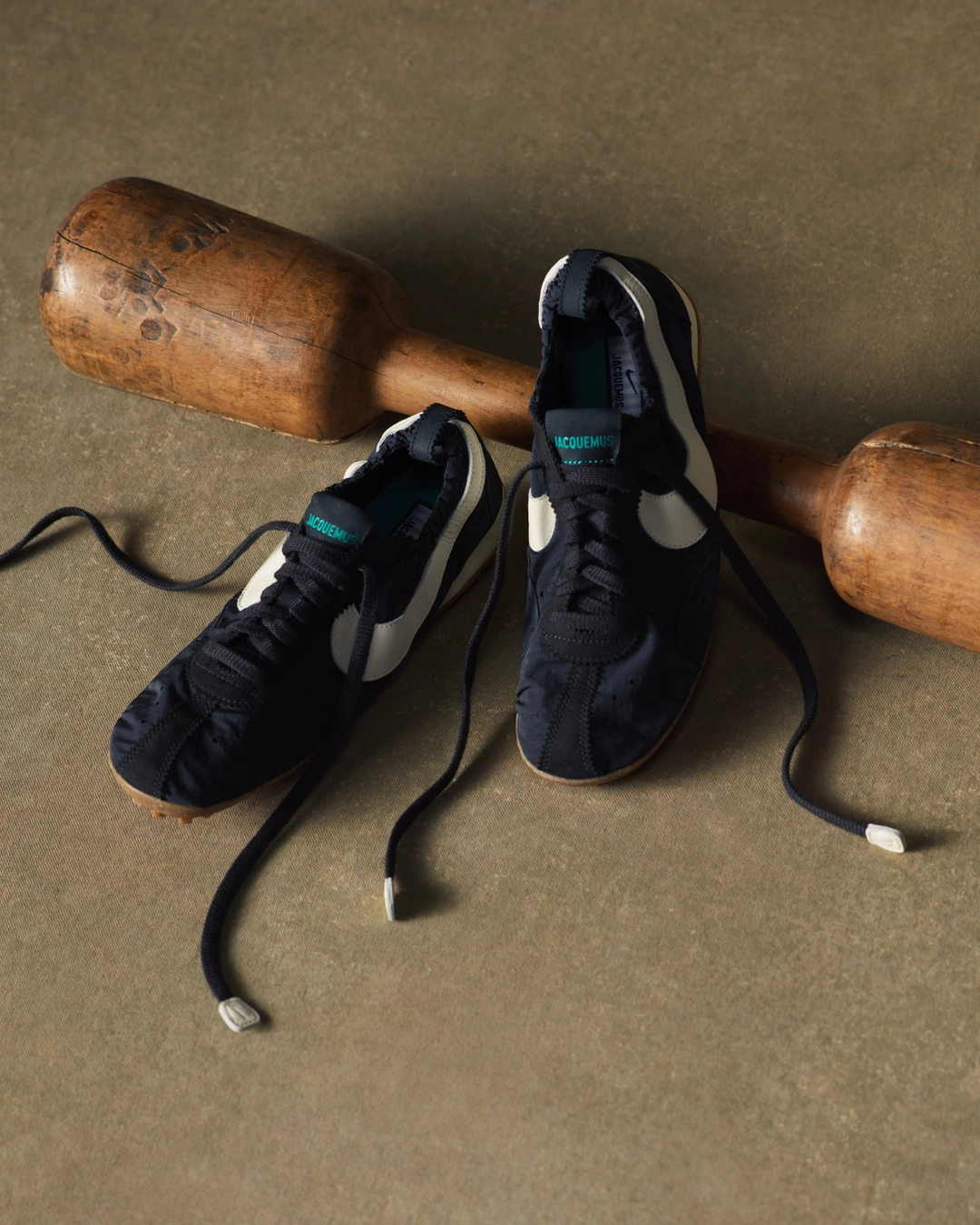 Hard Facts für den Warenkorb: Unisex-Sourcing, crinkled/ruched Nylon oben, Leder an Swoosh und Ferse, Jacquemus-Branding an Zunge, Ferse und Insole, recycelter Gummi unten. Preislich liegen wir in Europa bei 180 Euro.