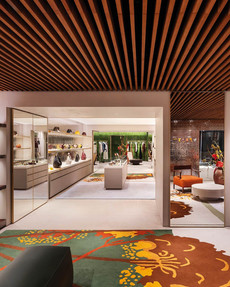 Das Setting spielt nicht Boutique, sondern Design-Manifest. Handgemachte Keramikfliesen in erdigen Braun- und Grüntönen, Marmor, Oak Vibes, Messing und Beton. Dazwischen samtweiche Leinenflächen, als Kontrapunkt zu den roughen Texturen. Möbel? Pure Sammlerstücke: George Nakashima und Isamu Noguchi chillen mit Gerrit Thomas Rietveld und den Berin Club Chairs. LOEWEs eigenes Lederhandwerk drückt sich in recycelten Leder- und Pufferpieces aus – Sustainability ohne Moralkeule, dafür mit echtem Style.